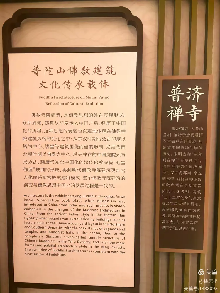 发表时间:2025-05-28 22:39来源:华北影响力 ![]() 昨天是2025年5月22日,我们4人组合浙江游的第六天。在酒店吃完早餐,8点半我们开车去码头,乘船去普陀山。我们去时万里无云,不想在游览中途,天降大雾,景区提醒随时有停船的危险,那样的话我们就会困在岛上,很麻烦,于是,我们放弃了近看南海观音的环节,下午2点提前登船返回朱家尖。本想第二天参观位于朱家尖的观音法界,这下可以提前参观了。 ![]() 现在不是普陀山的旅游旺季,但朱家尖码头的停车场还是停得满满当当。 ![]() 我们买了快艇的票,虽然贵了不少,但避开了排长队。 ![]() ![]() 快艇上合影。 ![]() 游船上所拍舟山群岛。 ![]() 普陀山到了。 ![]() 此时还是晴空万里。 ![]() 普陀山是中国佛教四大名山之一、著名的观音道场、国务院公布的首批国家级重点风景名胜区之一,素有“海天佛国”“南海圣境”之称。全山开放有寺院共四十多座,最大的是普济寺、法雨寺、慧济寺和宝陀讲寺。最大的地标是总高33米的南海观音大佛。普陀山四面环海,被誉为“第一人间清静地”。 ![]() ![]() 在网红地标前打个卡。 ![]() 乘坐索道先到佛顶山。 ![]() ![]() 在索道上拍摄的寺院群,此时已云雾升腾。 ![]() 佛顶山又名白华顶、菩萨顶,为普陀山之主山。山分支脉,分别向南、北、东伸延,主峰海拔291.3米,从远处眺望,诸峰若拱,峰顶垒垒如杯瓢,覆于积水之上。佛顶山高踞峰顶,视野可望千里,是观日出的最好去处。 佛顶山,1989年建成的观音堂,四壁镶嵌着123尊石刻观音像,它汇集了唐宋元明清五朝名画家的杰作。明代初建慧济庵,清乾隆五十八年扩庵为寺,光绪三十三年又经大力扩建,遂成普陀第三巨刹。 ![]() 又一处网红地标。 ![]() ![]() ![]() 来到慧济寺。 ![]() ![]() ![]() ![]() ![]() ![]() ![]() 慧济寺,俗称佛顶山寺,初建于明代,全寺占地20亩,建筑面积3300平方米,坐落于普陀山佛顶山上,因山制宜,布局包括天王殿后,大雄宝殿、大悲殿、藏经楼、玉皇殿、方丈室等俱在同一条平行线上,与左右厢房相拥,颇有浙东园林建筑风格,为其他禅林所少见。 ![]() 参观完慧济寺,我们乘景区的旅游巴士来到法雨寺。 ![]() ![]() 法雨寺又名后寺,是普陀山三大寺之一,创建于明万历八年(1580年),清朝康熙二十八年(1689年)重修,建筑面积33000平方米。 法雨寺总占地面积3.3万平方米,现存殿宇294间,面积大约9000平方米。全寺依山取势,分列六层台基上,入山门依次升级,中轴线有天王殿、玉佛殿、九龙观音殿、御碑殿、大雄宝殿、藏经楼、方丈殿、印光法师纪念堂等。其中天王殿、圆通殿和大雄宝殿是三座主要殿堂。 2006年5月25日,法雨寺被中华人民共和国国务院公布为第六批全国重点文物保护单位。 ![]() ![]() ![]() ![]() ![]() ![]() ![]() ![]() 法雨寺里的月季花都长得似莲花。 ![]() 我们游览的第三个寺庙是普济寺。 ![]() 普济寺,又称“前寺”,是普陀山三大寺之一,始建于后梁贞明二年(916年),清康熙三十八年(1699年)赐额“普济群灵”得名。寺院坐北朝南,占地2.6万平方米,中轴线布局依次为御碑殿、天王殿、圆通殿和藏经楼,集清代官式建筑大成,2013年被列为第七批全国重点文物保护单位。 ![]() ![]() ![]() ![]() ![]() ![]() 行程中包括观拜南海观音,但因天气原因,我们遗憾取消,只能在车上远观了。 普陀山南海观音立像坐落在双峰山南端的观音跳山岗上,矗立于南海之巅,背靠幽深青翠的紫竹林,隔海远眺朱家尖彼岸。 1996年,普陀山佛教协会为庄严菩萨道场,弘扬大士圣德发起建造普陀山南海观音立像。1997年10月30日,普陀山南海观音铜像建成开光。 普陀山南海观音立像采用新型仿金铜精铸,所塑造的铜像是天身,非男非女,为“飘海观音”的形象。 普陀山南海观音立像、净高20米,莲座高2米,底座双层大厅,与铜像合一,总高33米。 ![]() 由于担心雾大停航,我们提前结束了在普陀山的游览,返回朱家尖。 ![]() 提前参观观音法界。 ![]() 普陀山观音法界位于舟山市朱家尖白山脚下,占地面积2500亩,总建筑面积30万平方米,水系面积12公顷,中心湖小南海平均水深2米,主要功能为行洪、排涝、蓄水及生态景观功能,水源为山体雨水汇流,原水水质较好。 普陀山观音法界是以观音文化为主题,融合弘法、文化传播、观光圣境等内容,集文化体验、艺术展示、文化交流以及观光服务等功能于一体的观音文化主题博览园。 2023年11月14日,“观音文化园”观音法界项目落成开园。 ![]() ![]() 普陀山观音法界总体布置以香莲路为轴线依次展开,从东至西分别布局普隐精舍、中国佛学院普陀山学院男众部及扩建工程、观音圣坛及观音公园、居士学院、正法讲寺5个功能组团。 2021年6月,普陀山观音法界项目获RICS中国奖2021年度冠军奖项。 2021年12月,观音文化园荣获2020-2021年度中国建设工程鲁班奖(国家优质工程)。 2022年6月,普陀山观音圣坛室内灯光设计荣获第39届IALD国际照明设计奖——IALD卓越奖。 2023年4月,普陀山观音文化园工程入选第二十届第一批中国土木工程詹天佑奖。 2023年,普陀山观音法界获得上海市优秀勘察设计奖。 ![]() ![]() ![]() 观音圣坛为“一主两从”品字形建筑群,两侧分别是善财楼和龙女楼,建筑整体布局具有向心性和对称性,主体建筑创意坚持“圣坛即观音”的整体定位,按照普陀山普济禅寺的毗卢观音坐像,根据意向和具象结合的设计理念,突出观音元素,整体建筑给人以
