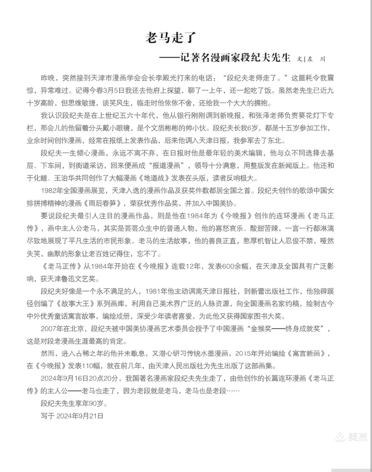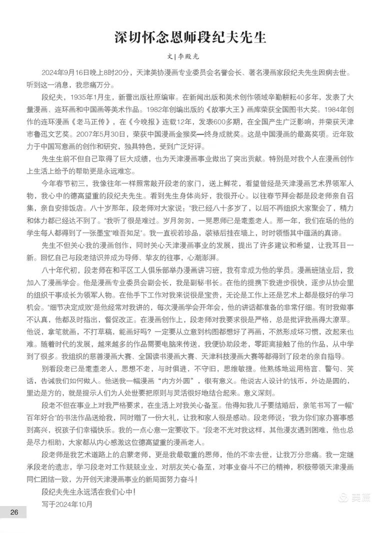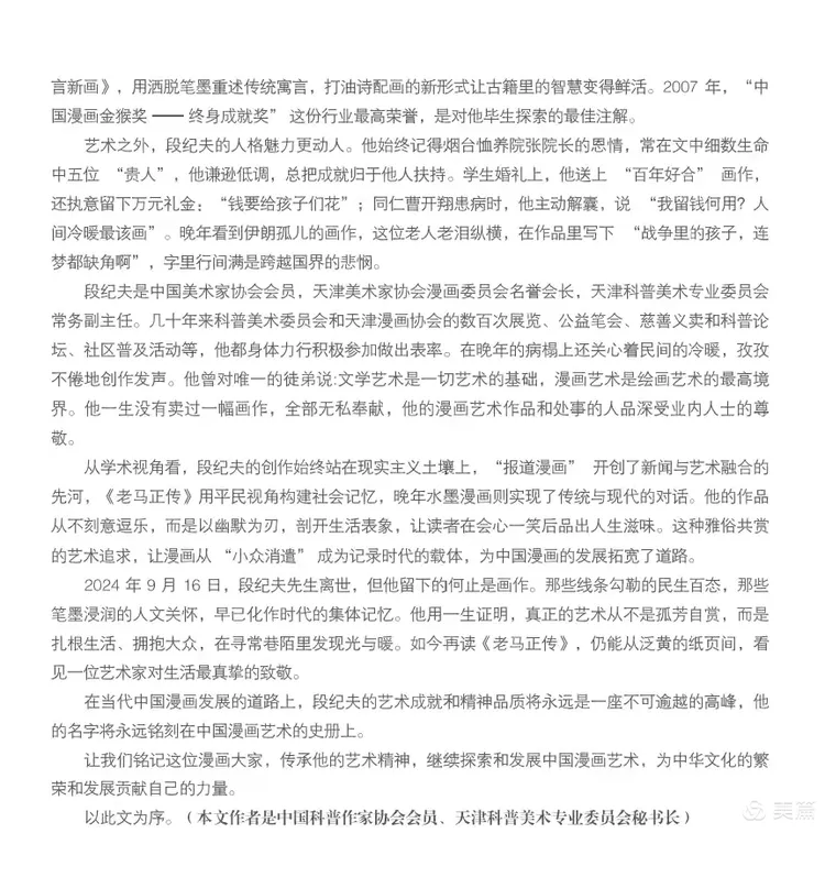 发表时间:2025-09-15 06:38来源:华北影响力 由天津市科普作家协会美术专业委员会主办、画讯俱乐部承办的“高山仰止一一纪念漫画家段纪夫先生逝世一周年书画邀请展”将于2025年9月16日在天津湾凯德写字楼揭幕。 段纪夫(1935年1月—2024年9月16日)是天津美术学院毕业的中国著名漫画家,曾任新蕾出版社编审,致力于漫画、连环画和中国画创作。其作品《老马正传》,以普通市民“老马”为主角,展现幽默与人生百态,连载12年、发表600余期,获天津市鲁迅文艺奖,被誉为中国漫画经典形象之一。 他于1982年创编出版的《故事大王》画库获全国图书大奖。 段纪夫先生本人于2007年获得“中国漫画金猴奖——终身成就奖”,这是中国漫画领域最高荣誉。 段纪夫先生晚年致力于水墨漫画创作,同样取得很高成就。2024年9月16日,段老因病在天津逝世,享年90岁。 天津科普作家协会是天津市科协直接领导的多学科社团组织,于1978年正式注册批准为市一级社团组织,该协会下设的美术专业委员会同时合法成立。 该委员会由著名画家王山岭担任主任,段纪夫先生担任常务副主任,漫画家左川担任副主任,中国科普作家协会会员刘峰任秘书长。 为纪念这位卓有成就的漫画家,感恩段老担任常务副主任之职时为天津科普作协美术专业委员会开展各项活动做出的贡献,由著名画家王山岭发起组织了此次书画邀请展。 参展书画家(按姓氏笔画排序)有:王山岭、王峰、王润昌、王旭、孙云川、刘长龙、刘立君、刘秀芝、李向群、李仁政、纪荣耀、刘峰、朱文先、刘家城、毕恭、陈元龙、佟有为、陈英杰、张瀛洲、季家松、郭凤祥、赵玉山、赵同相、郭振山、高振恒、袁桂兰、徐燕、阎维海、窦金彪。 书画家们以书法、绘画的形式精心创作,表达对段老的敬意和缅怀之情,其中不乏纪念段老的诗词、楹联,感人至深。本次展览还出版了画集,收录了全部参展作品。 展览时间:2025年9月16日至10日16日。 展览地点:天津市河西区南北大街1号天津湾凯德写字楼B座824。 逢周六对外免费开放(上午9点半至12点,下午2点至4点),其他时间观展可预约,预约电话:13920461406。 ![]() (段纪夫先生) ![]() (段纪夫先生的漫画作品) ![]() (本次画展的展标) ![]() (本次画展作品集封面) ![]() ![]() (以上是作品集序) ![]() (作品集收录的纪念文章) ![]() (作品集收录的纪念文章) 本次展览全部作品一一 ![]() 王山岭作品 ![]() 王峰作品 ![]() 王润昌作品 ![]() 王润昌作品 ![]() 王旭作品 ![]() 孙云川作品 ![]() 刘长龙作品 ![]() 刘立君作品 ![]() 刘秀芝作品 ![]() 张弘词 李向群书 风入松 缅忆段纪夫先生 文/张弘 艺途驰誉百年悠。 墨韵长留。 多年绘事才情展,漫画妙、笔底春秋。 画库曾膺国奖,连环更惹风流。 津门因老马无愁。 一纪霜秋。 金猴成就名高显,忆音容、涕泗盈眸。 幸有丹青传世,千秋缅念鸿俦。 ![]() 李仁政作品 ![]() 纪荣耀作品 ![]() 刘峰作品 ![]() 朱文先作品 ![]() 刘家城作品 ![]() 毕恭作品 ![]() 陈元龙作品 ![]() 佟有为作品 ![]() 张弘诗 陈英杰书 七律 缅忆段纪夫先生 文/张弘 痛怀俊彦悼贤翁, 九秩春秋德望隆。 漫画才情凝妙笔, 刊林雅趣绘尘风。 传中老马彰时态, 库内大王开幼蒙。 誉就金猴辉艺梦, 遗香水墨映高崇。 ![]() 张瀛洲作品 ![]() 季家松作品 ![]() 郭凤祥作品 ![]() 赵玉山作品 ![]() 赵同相作品 ![]() 郭振山作品 ![]() 高振恒作品 ![]() 袁桂兰作品 ![]() 徐燕作品 ![]() 阎维海作品 ![]() 窦金彪作品