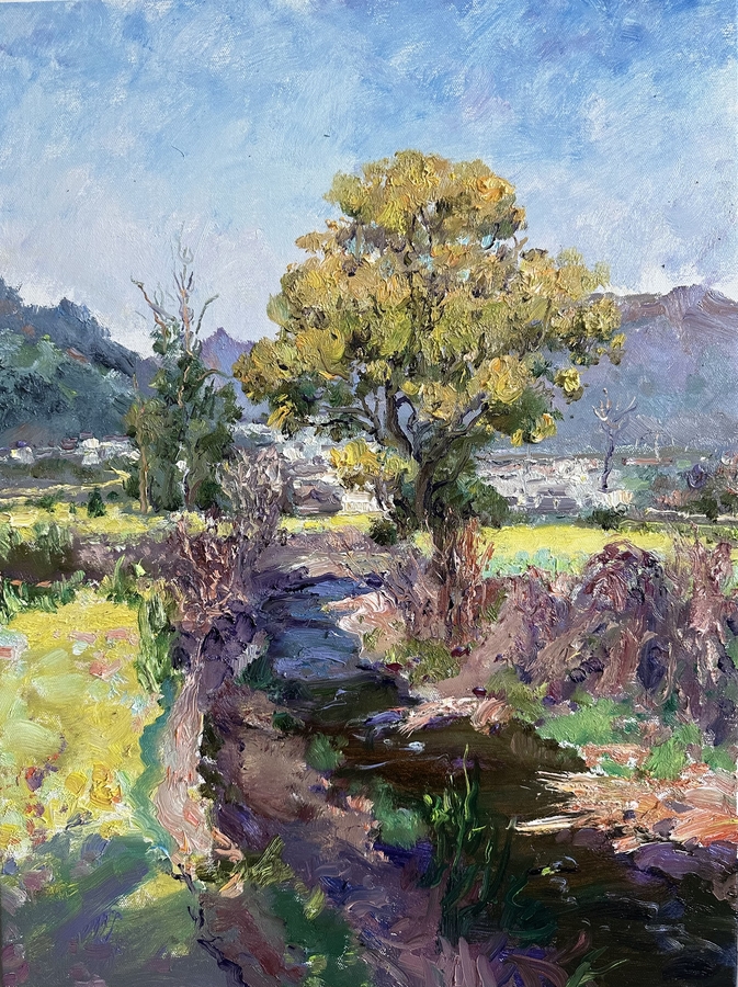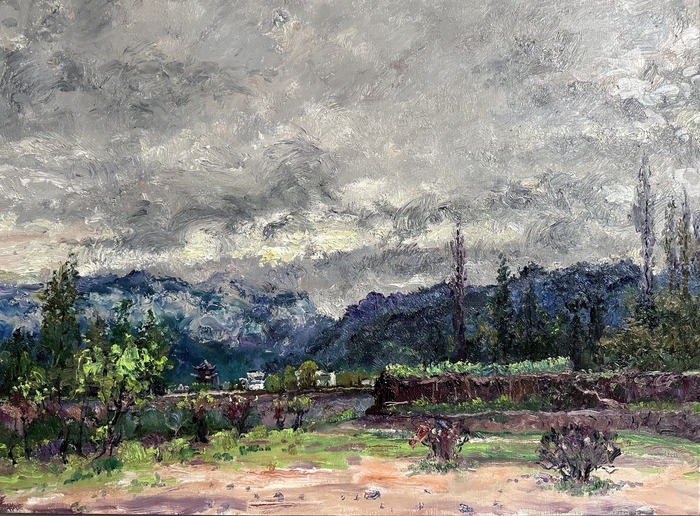 他的画笔,展现的是醇厚的西画功力;他的画眼,掇取的是中国山水的写意精神。画笔下颜色铺陈,空间空气如幻似真;构图中景物经营,山川连绵浑厚华滋。
