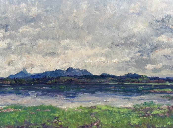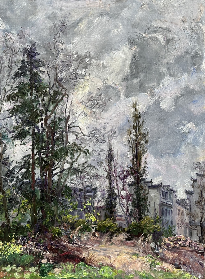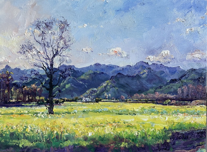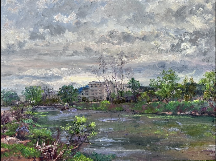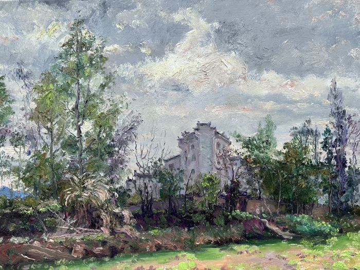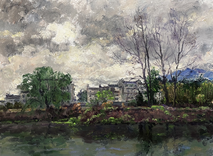 画家曾多次前往欧洲各大美术馆观摩大师们的作品,莫奈、西斯莱等大师的技法,画家熟稔于心,他的风景画,一见即知是脱胎于法国印象派。天光云影下,“春山如黛草如烟”。